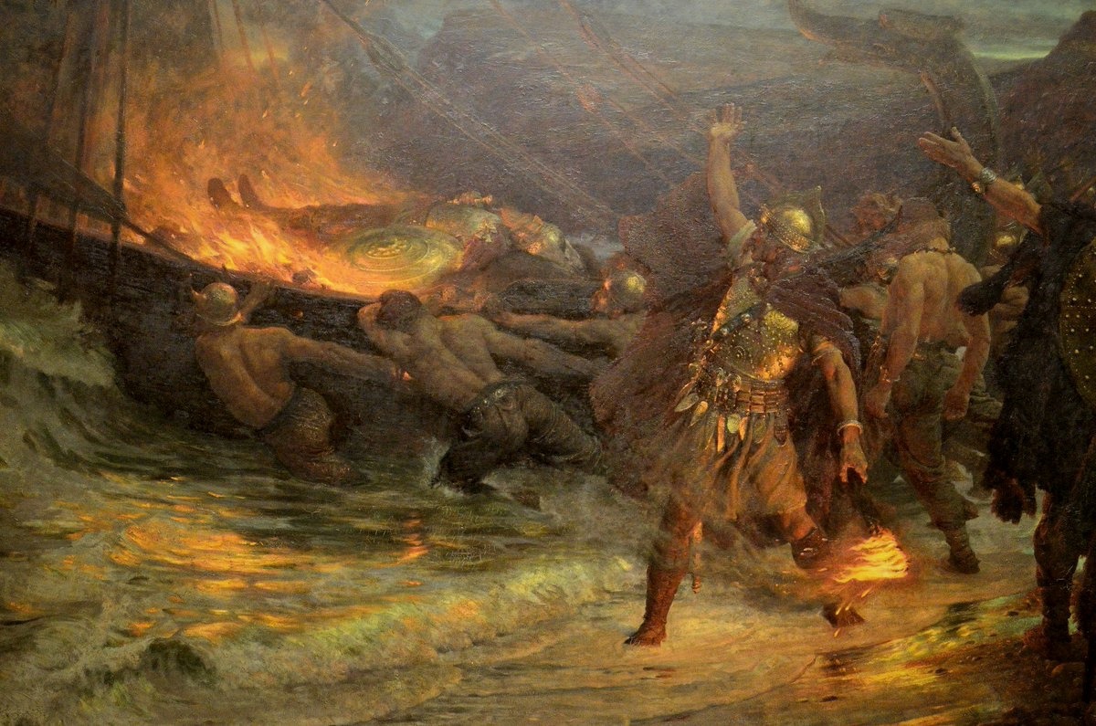 Древнескандинавские петроглифы, курганные захоронения и тексты свидетельствуют о ритуальных похоронной процессии политеизма Фенноскандии. В Нордической космологии рассказывается, как на воду была спущена ладья Хрингхорни (Hringhorni), несущая погребальный костёр Бальдра (Baldr), а его горем поражённая жена Нанна (Nanna) пожертвовала собой. Боги и йотуны провожали ладью, в которую вложили кольцо Драупнир (Draupnir), а конь Бальдра сгорел вместе со всей его сбруей.